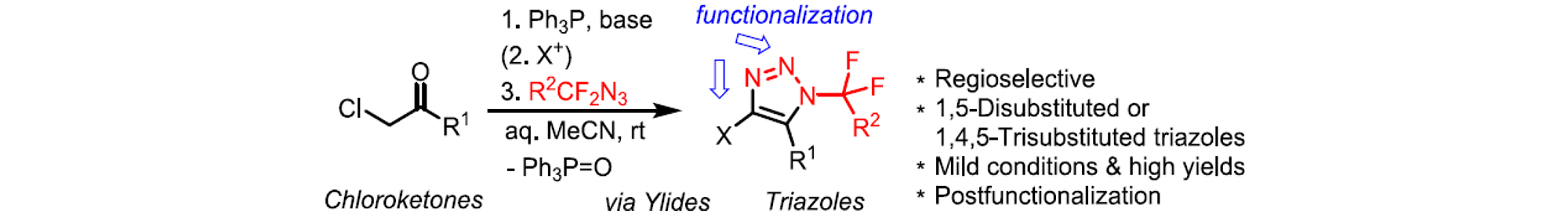 Microwave heating of N-(per)fluoroalkyl-1,2,3-triazoles led to denitrogenation and rearrangement to provide stable ketenimines, which underwent addition of nucleophiles or [2 + 2] cycloadditions (Organic Chemistry Frontiers 10: 3201, 2023). Potassium fluoride-mediated induced the 1,3-fluorine shift and led to the formation of isoquinolines (Organic Chemistry Frontiers 12, 4442, 2024).